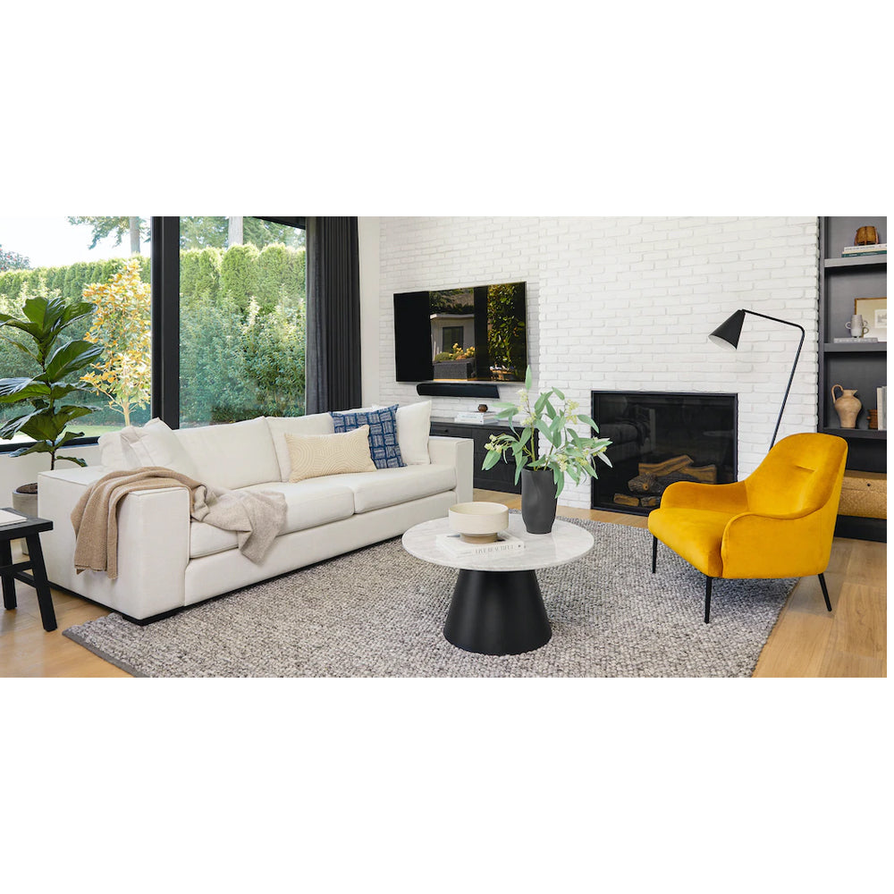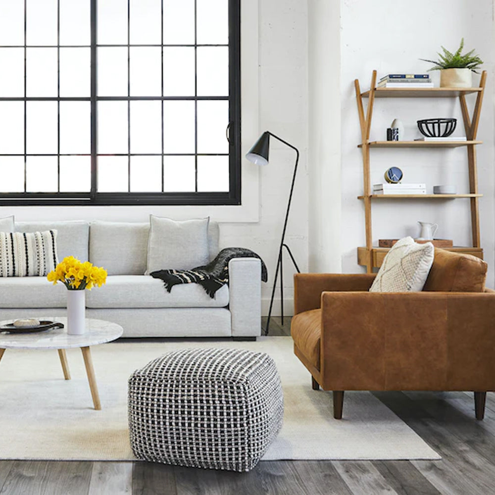 Estructura elaborada artesanalmente en madera reforestada. Espuma de alta densidad y guata ajustadas para brindar un soporte cómodo. Tapizado en material resistente, fácil de cuidar. Patas promedio que elevan el mueble sobre el nivel del suelo.
